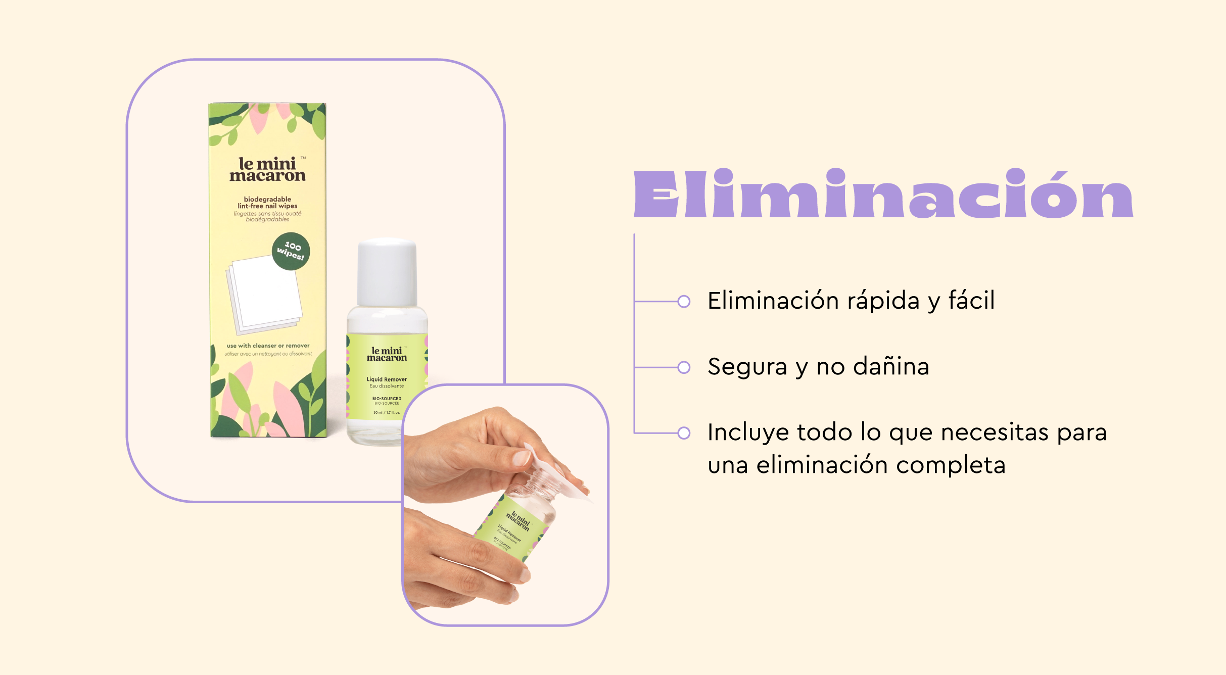 - Quitaesmaltes líquido: sin acetona, y de origen bio. Elimina suavemente el esmalte con una fácil aplicación.