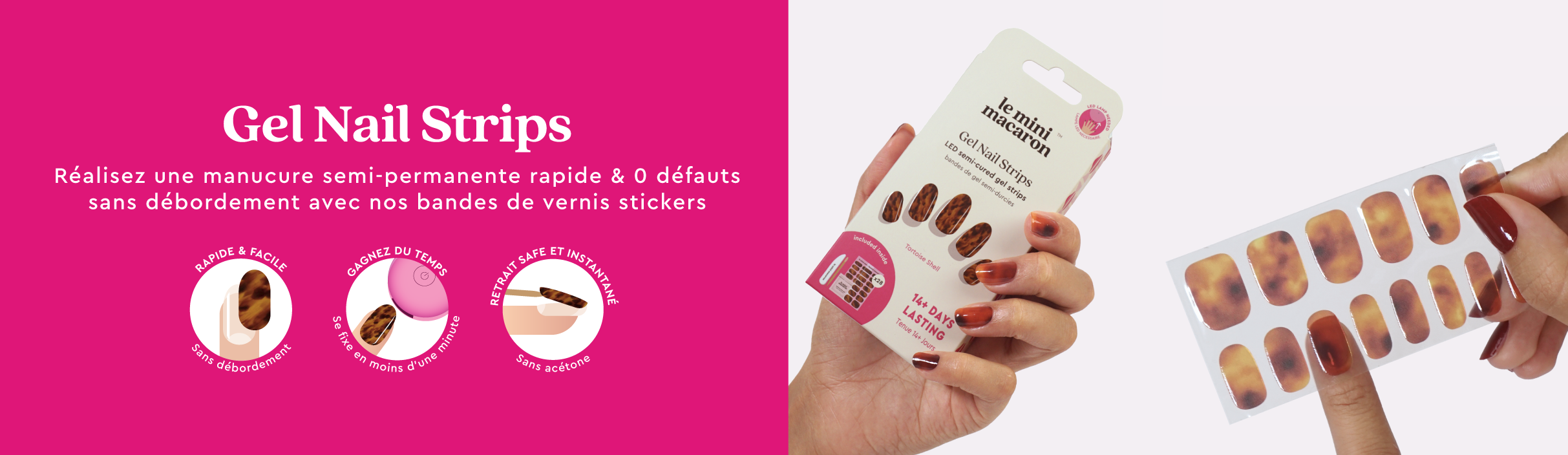 Les bandes adhésives en gel pour ongles, également appelées bandes en gel, bandes en gel semi-durci et, plus rarement, wraps en gel pour ongles, apportent une touche élégante et durable à votre manucure. Elles s’appliquent directement sur l’ongle et, étant composées de gel mais seulement semi-durci, elles nécessitent un durcissement supplémentaire sous une lampe LED. Le Mini Macaron est la marque de référence pour une large sélection de ces bandes en gel.