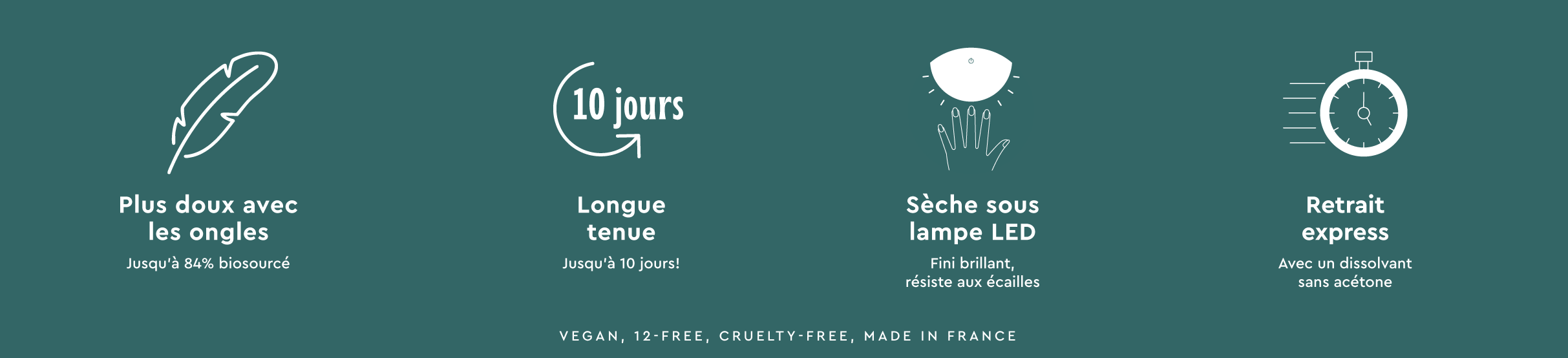 - Il est 12-free, formulé sans HEMA, toluène et surtout sans monomères acrylates, des particules réputées pour être allergisantes.