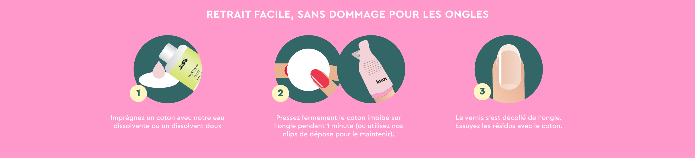 - Pas besoin non plus d’acétone, un actif déconseillé pour les ongles & les peaux sensibles, ou de lampe UV.