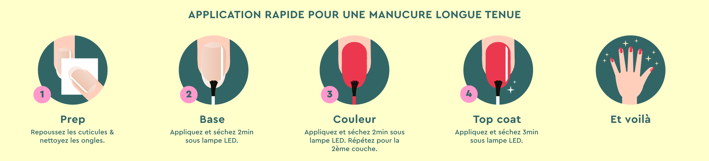 Le Soft c’est une manucure LED respectueuse des ongles en 3 étapes : base, vernis et top coat.