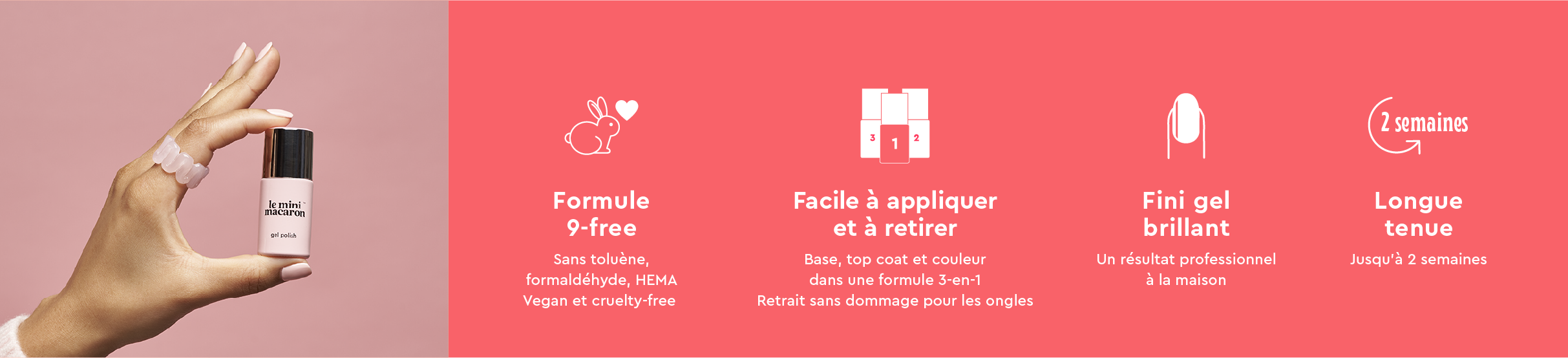 Facile à appliquer, notre vernis à ongles semi-permanent combine base, vernis et top coat dans un seul flacon !