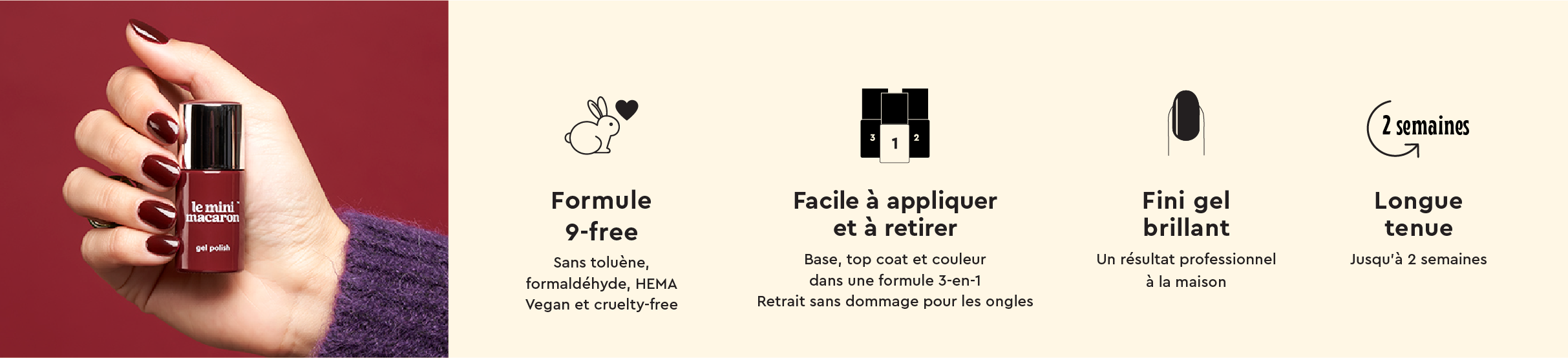 Le vernis est formulé sans : formaldéhyde, résine de formaldéhyde, TPHP, acétone, éthyl tosylamide, xylène, DBP, toulène et camphre.