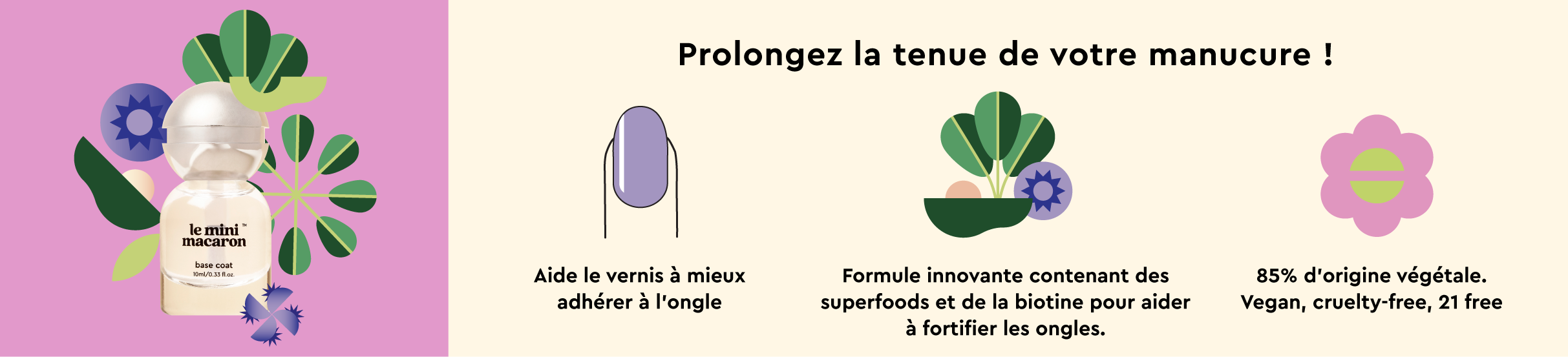 Cette base se dépose facilement sur l’ongle et aide le vernis à mieux adhérer, prolongeant ainsi la durée de votre manucure. Une formule innovante qui contient des superfoods et de la biotine pour aider à fortifier les ongles. 85% d'origine végétale. Vegan, cruelty-free, 21-free.
