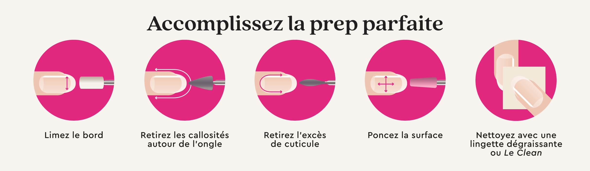 Travaillez dans une seule direction pour éliminer les résidus de peau ou de produit. Faites glisser l’embout sur toute la surface de l’ongle pour lisser et préparer avant l’application du vernis.