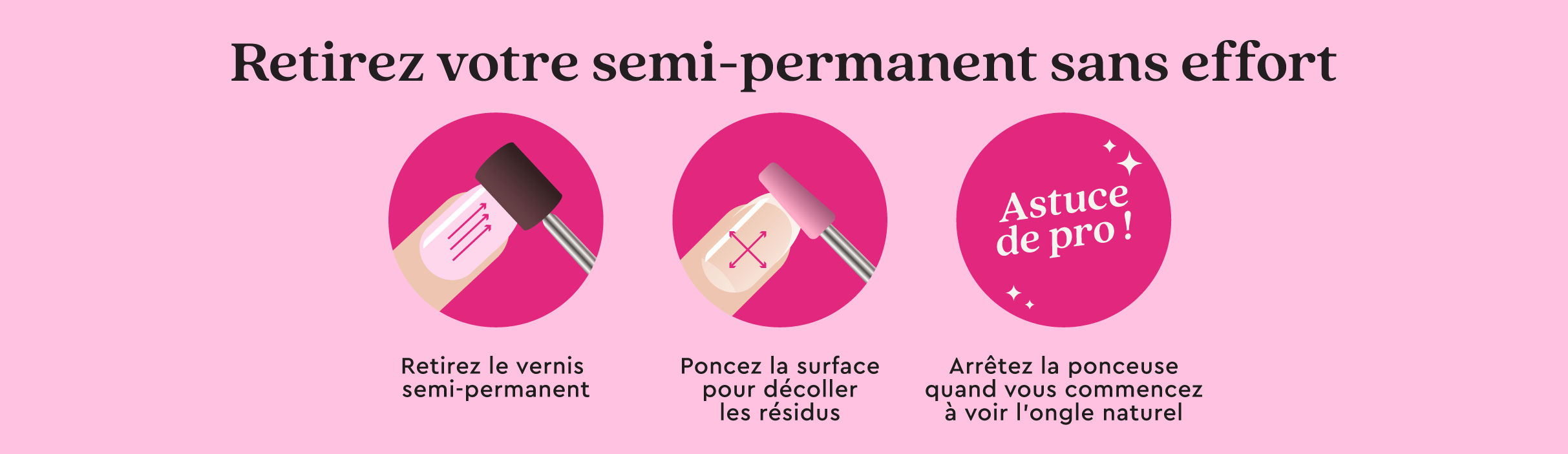 Pour des raisons de sécurité, ne retirez que les couches supérieures du vernis semi-permanent. Une fine couche de vernis doit rester visible après utilisation de la ponceuse.