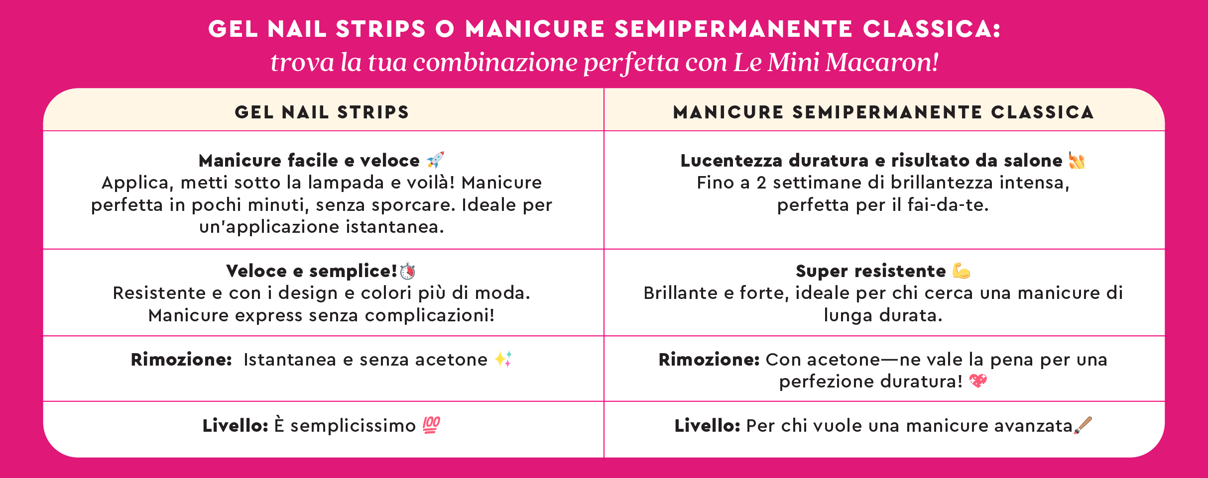 - LIMA : Limare il bordo delle unghie per rimuovere l'eccesso e dare forma alla manicure finale. Consiglio professionale: Per una finitura lucida e duratura, completare la manicure con il nostro Gel Shine Top Coat.