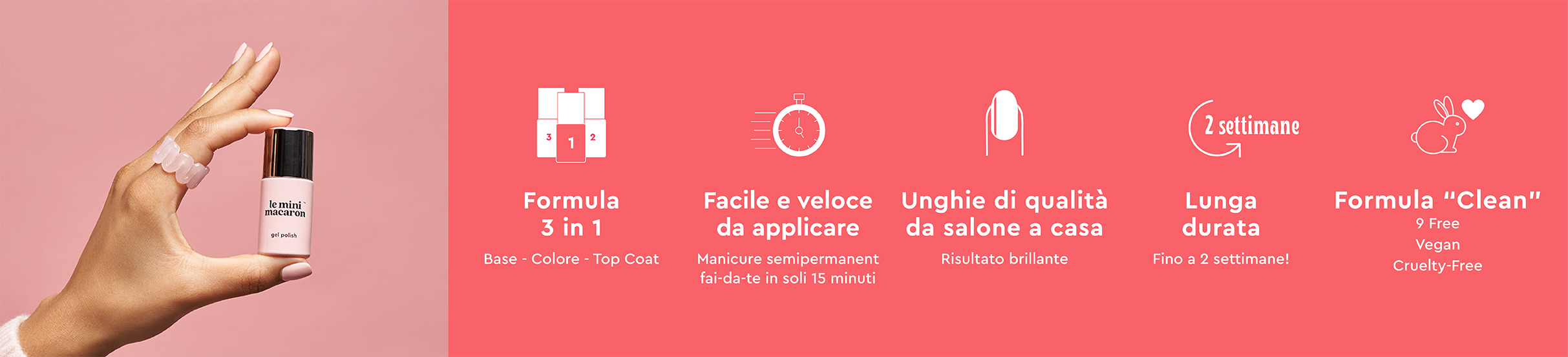 Lo smalto è formulato senza: formaldeide, resina di formaldeide, TPHP, acetone, etil tosilamide, xilene, DBP, toulene e canfora.