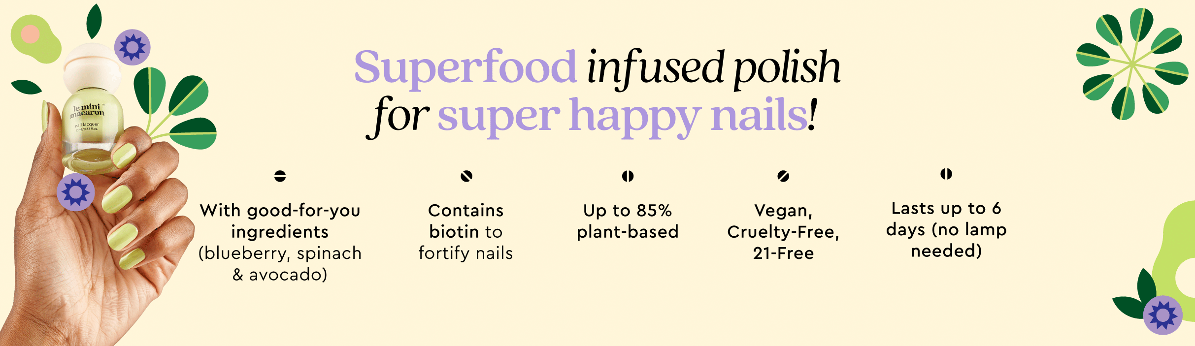 Le Sweet is a unique plant-based formula that we developed! We infused our nail polish with a mix of good-for-you superfoods (blueberry, spinach, and avocado), as well as adding biotin to help fortify nails. Up to 85% plant-based and bio-sourced, vegan, cruelty-free and 21-free. Compared to other nail polishes, our non-toxic formula is more eco-friendly with added nourishment, while maintaining vibrant color and durability. In fact, 88%* of our customers said their nails looked visibly healthier after using Le Sweet.